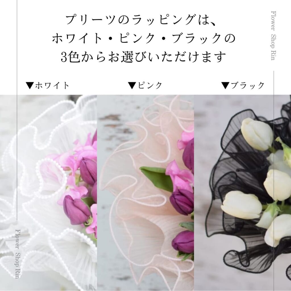 プリーツのラッピングは、ホワイト・ピンク・ブラックの3色からお選びいただけます。